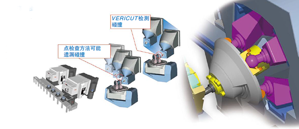 一次機床碰撞,代價昂貴,不僅潛在地毀壞着機床,而且,延誤了整個(gè)生(shēng)産計(jì)劃!但(dàn)是使用可(kě)以顯著減少(shǎo)錯誤的VERICUT,幾率,避免花(huā)費寶貴的加工時(shí)間(jiān),在實際機床上(shàng)進行(xíng)新程序試切。機床仿真可(kě)以檢測所有(yǒu)機床部件,如軸滑塊、主軸頭、轉塔、旋轉工作(zuò)台、主軸、刀庫換刀、夾具、切