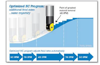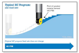 切削大(dà)量材料時(shí),刀具進給率降低(dī);切削少(shǎo)量材料時(shí),進給率相應地提高(gāo)。根據每切削步切削的材料量的不同,優化模塊可(kě)以自動計(jì)算(suàn)并在需要的地方插入改進後的進給率。不改變程序軌迹,優化模塊是通(tōng)過更新原程序切削速度創建新的數(shù)控程序。